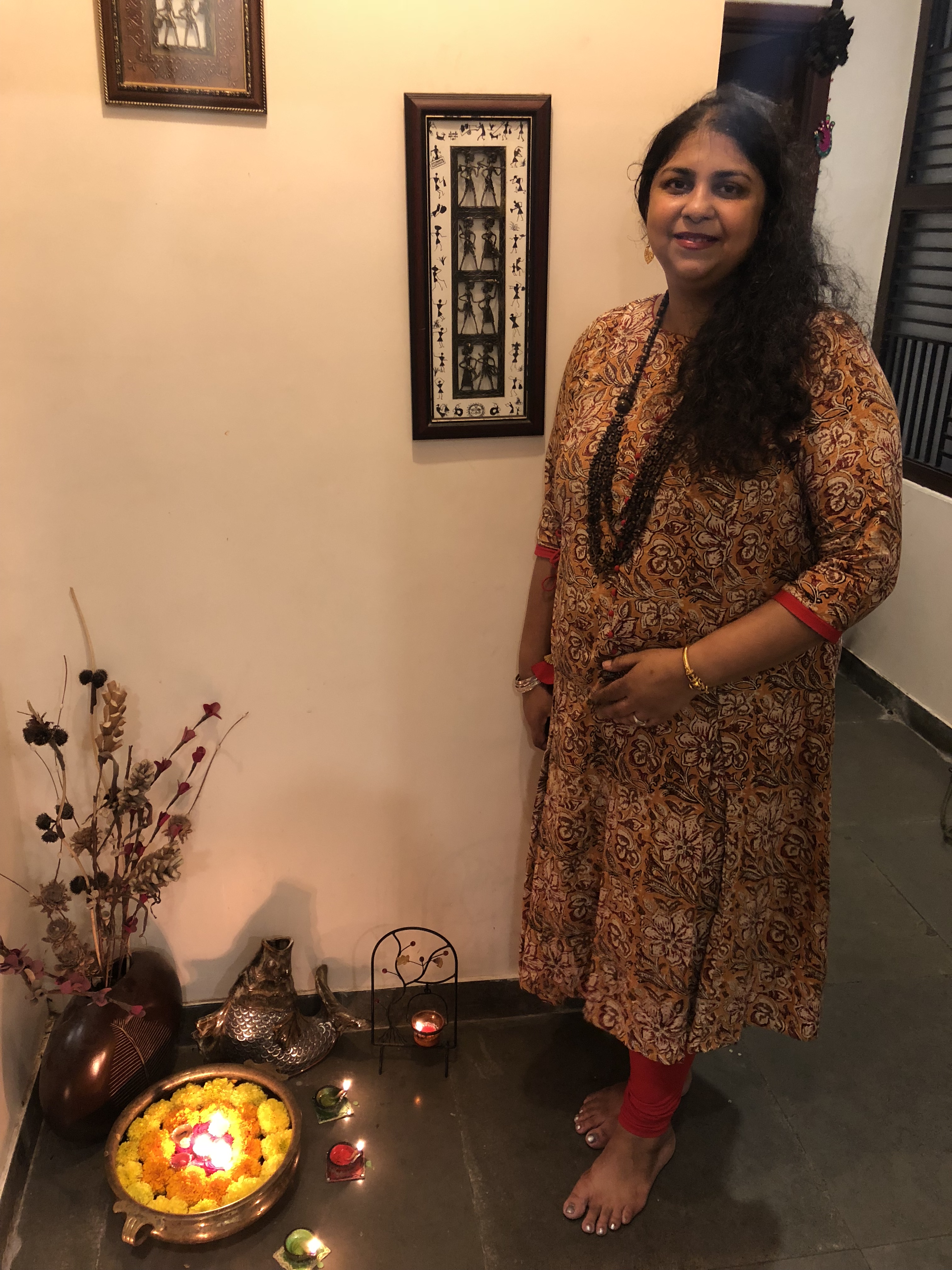 Look 2 Simple, Smart and Comfortable The Kurta revamped.In my previous life, I always went with simple, straight cuts with side slits that in my opinion gave me the illusion of a better figure. I never touched those in which the side slits were given a miss. Fab India was my friend because of their cuts, prints and overall looks. I felt comfortable in their silks on formal occasions because of their no-nonsense cuts with three-fourth sleeves and sometimes high necks and prince collars. It made me feel in command in official meetings. Then I stepped into Sanginee, a boutique that works with bold cuts; I have noticed inspirations from places one would not have imagined taking. I learnt to wear Anarkalis after 25 years and worked with bolder necklines and patterns.This mustard and red cotton number has been on my to-buy list for almost six months. I loved it yet never felt I could carry it off. In fact I bought it when other pieces of the same or similar cut were already sold.The kurta has pleats that are similar to box-pleated sports skirts of my school. I had instantly seen the possibilities of traversing this look to a dress however to do that I needed to live in the dress. I am glad I bought this, even though it needed a few tucks and stitches to get the cut lengths of the box pleats to my liking.The Kalamkari print also was not the run-off-the-mill kind and the material hugged the body well without being stiff in places. Bright red churidars completed the look.The wooden beads necklace is my go-to necklace for attires of all kinds – western or Indian. Yes, I graduated to wood, seed and cloth jewellery even, in my forties though I did team it up with a gold jhumka and bracelet because it was Diwali and the mood was celebratory.