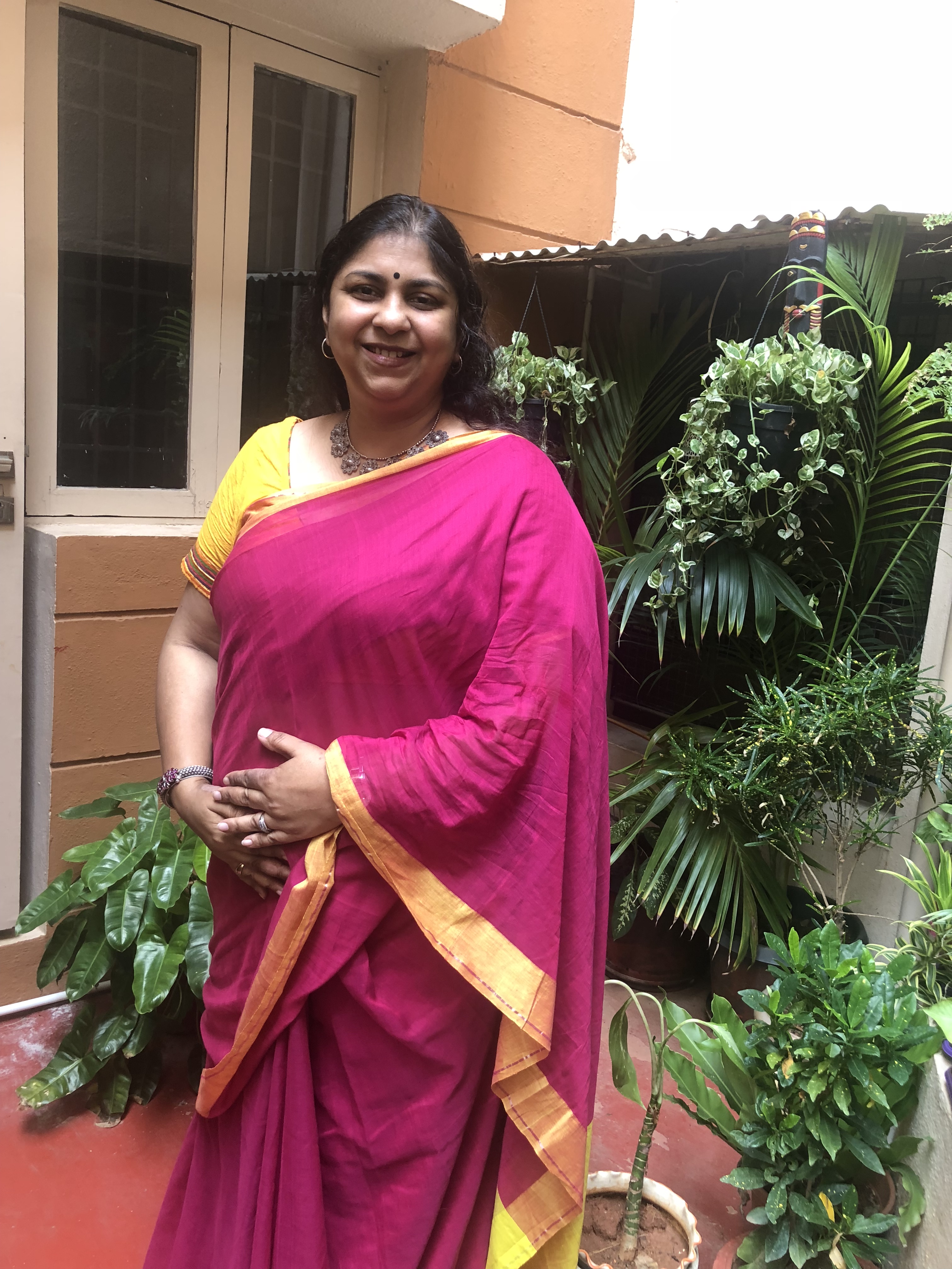 The all-forgiving, ubiquitous sari. Saris to me was about if there is no matching blouse I cannot wear that sari. It was something that one wears on special occasions and only the fancy silk variety that looks grand and well-set on the body.In my forties, I learnt to step out in a sari that boldly draped over shoulders that showed a blouse with colours that had no connection with the sari. In fact I rebelled in the blouse does not match proclamation! I got a selection of blouses stitched in bold hues that could work with saris of colours that were either bright and flashy or dull. Blouses that lit up the sari in a manner in which the attached blouse we buyers are so fond of, would never do. This look is put together with a bright rani pink Bengal cotton sari. which is buttery soft and cocoons the wearer in the folds. Nothing describes fuchsia as well as rani pink, a colour so named because it was a combination of rare purple fit for royalty and pink. This is worn with a yellow blouse that doesn’t really match exactly with the borders but still works. I teamed it with a chunky silver floral filigree necklace, an antique finish bracelet a setting of fuchsia stones, from GRT jewels, white gold and diamond hoops from Carat Lane and silver sandals from Clark’s. After years of snobbishly wearing only gold, I hesitatingly moved to rose gold and then white gold to try whether I could work with colours that only the fair-skinned people seem to feel confident with. One day, I graduated to silver- a metal I fell in love with all over again when I discovered the variety I could play with in accessories and style without draining my savings. I also discovered that I could no longer rely on flimsy footwear that gave up on me on the second wear and have permanently moved to sturdy brands like Clark’s and Hush Puppies.