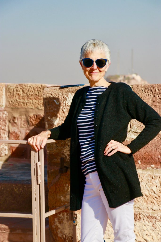 I’m 60 and with the white hair to prove it. I love being old in India where I get respect, admiration and half price on the train. And I chose this outfit to celebrate it all.